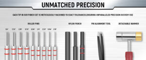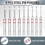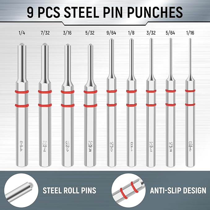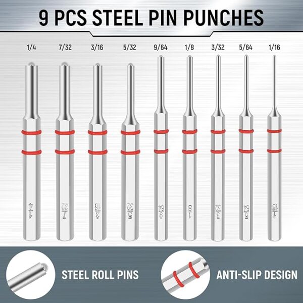 【PUNCHES】All the steel punches tool are treated specially, which makes it more durable and sturdy than other brands. Pin is the most easily broken part in the whole set. We provide excellent quality pins, so that you can avoid the abandonment of the whole roll pin punch set due to the fracture of one pin.