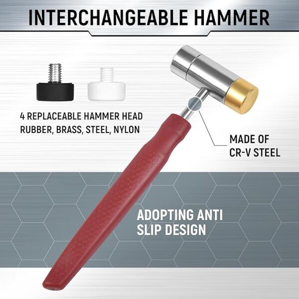 【HAMMER】Punch Set with bigger and heavier hammer head, the hammer is easier to hit. And the two ends of the hammer are detachable. We provide you 4 interchangeable hammer heads (rubber, brass, steel and nylon), you can choose the appropriate one according to your own needs.