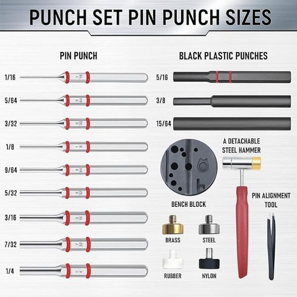 【INCLUDES】This gun tool kit includes a bench block, 1/16, 5/64, 3/32, 1/8, 9/64, 5/32, 3/16, 7/32, 1/4 steel punches, 3/8, 5/16, 15/64 plastic punches, a pin alignment tool, a hammer and 4 detachable hammer heads.