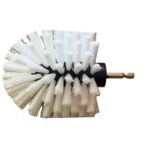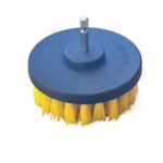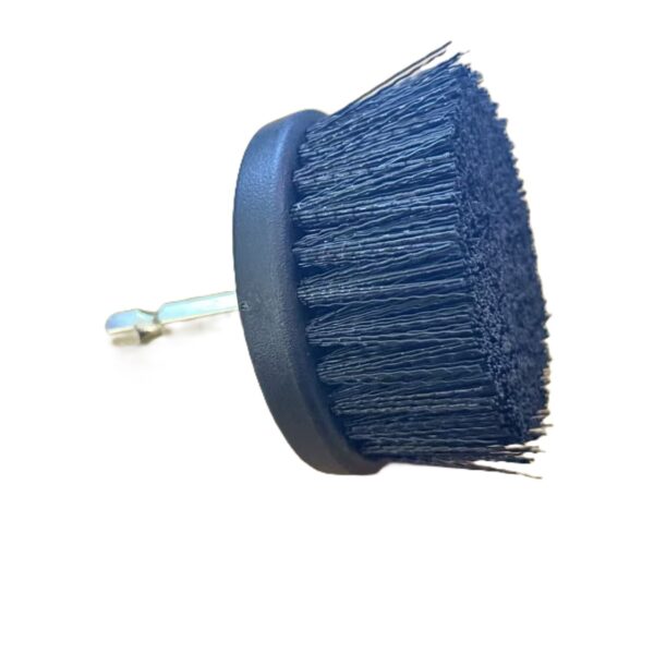 Bristle length is one inch and the bristles are soft. Brush attaches to most cordless drills.
