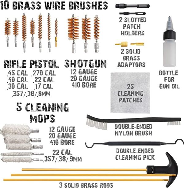 EXTENSIVE GUN CLEANING POWER: A wide range of full-service tools for cleaning 45-cal., .40-cal, .357/.38-cal./9mm, .30 cal., .270 cal., .22 cal., and .17 caliber firearms and 12-ga., 20-ga., and 410 shotguns.