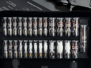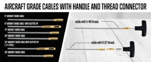 Brushes: .17 /.20 /.22 / .40 /.45 / .243 / .270 / .35 / 9mm / .30 / .38 / .410 / .50 / 5.56mm / 12GA / 16GA / 20GA / 28GA; Mops: .17 / .22 / .30 / .35 / 9mm / .40 / .410 / .50 / 12GA / 20 GA; Jags: .17 /.22 / .248 /.35 / 9mm / .25 / .270 / .30 / .338 / .375 / .40 / .44 / .45/ .50.