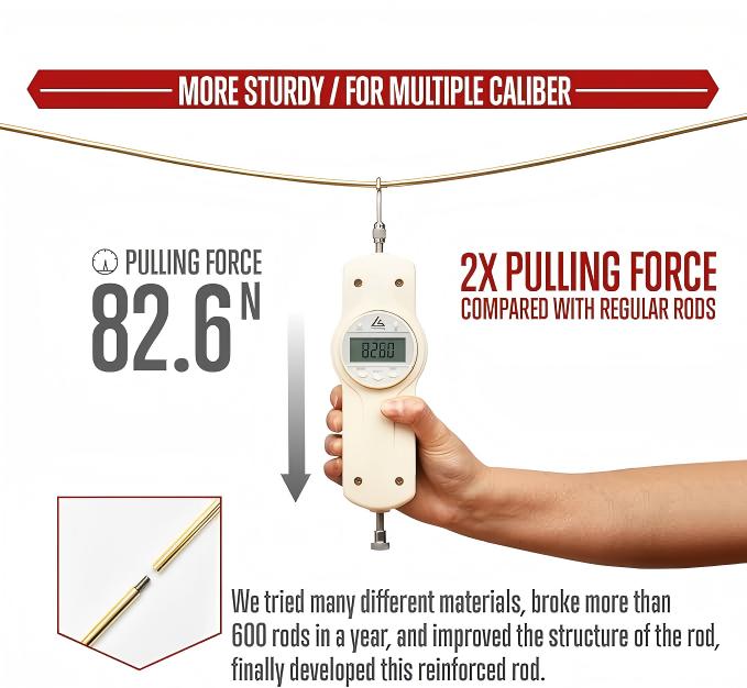 - The rods had underwent a lot of testing before starting production, we tried copper, iron, stainless steel, aluminum and other materials, broke more than 600 rods in a year, and tested and improved the structure of the rod, and finally developed this reinforced rod, and the rod has a longer service life. It can be said that the rods of this gun cleaning kit are the best on the US market.