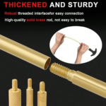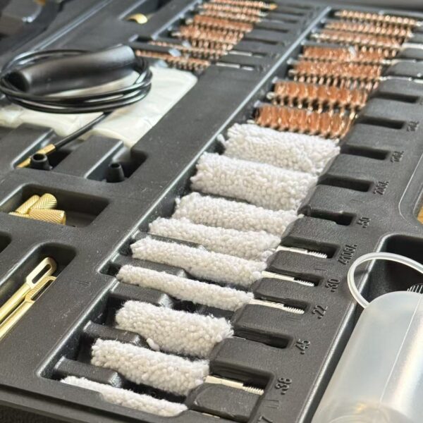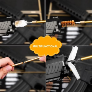【Package Details】 The delivery package contains 6xsolid brass rods, 1×33.1″ wire rope, 1xhandle, 14xbronze brushes (with augmented brush density), 9xcotton mops, 13xspear-pointed brass jags, 4xbrass slotted patch loops, 3xutility brushes, 3xmuzzle guards, 3xaccessory adapters, 50xcleaning patches with 4xpolishing clothes, 1x.22 chamber brush, 1x.22 brass brush and 1xempty bottles (50ml).