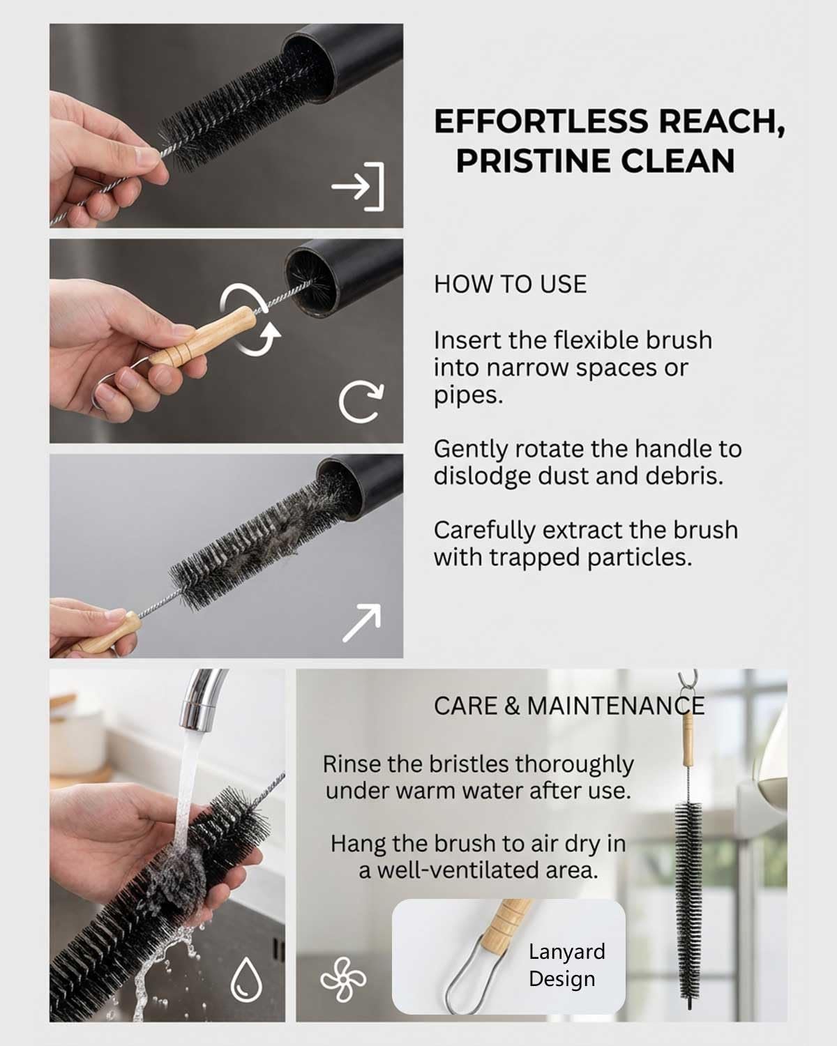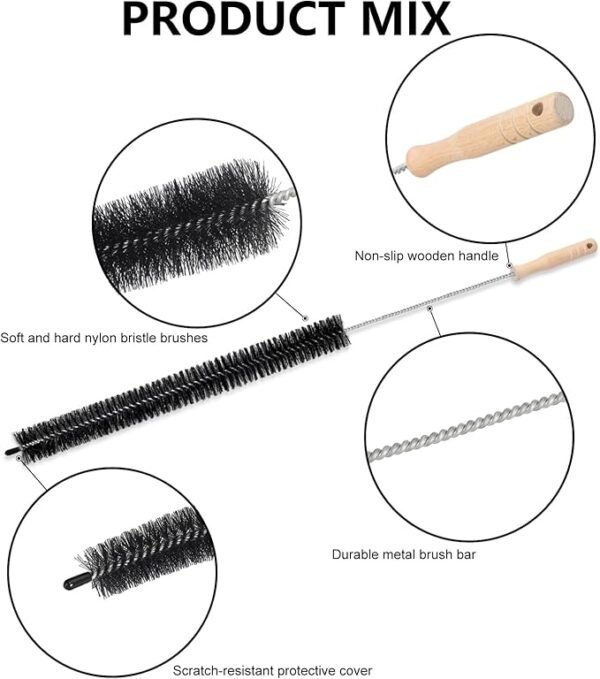 • The bendable stainless steel wire shaft allows for thorough cleaning of pipelines and hard-to-reach areas. Adjust the brush to different angles and bends to ensure comprehensive cleaning from various directions. For best results, wear gloves during use to protect your hands.