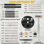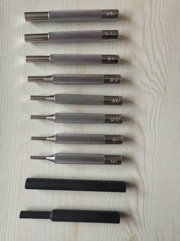 8Pcs carbon steel chrome plated punches 1/8″, 9/64″, 5/32″, 3/16″, 7/32″, 1/4″, 9/32″ and 5/16″.